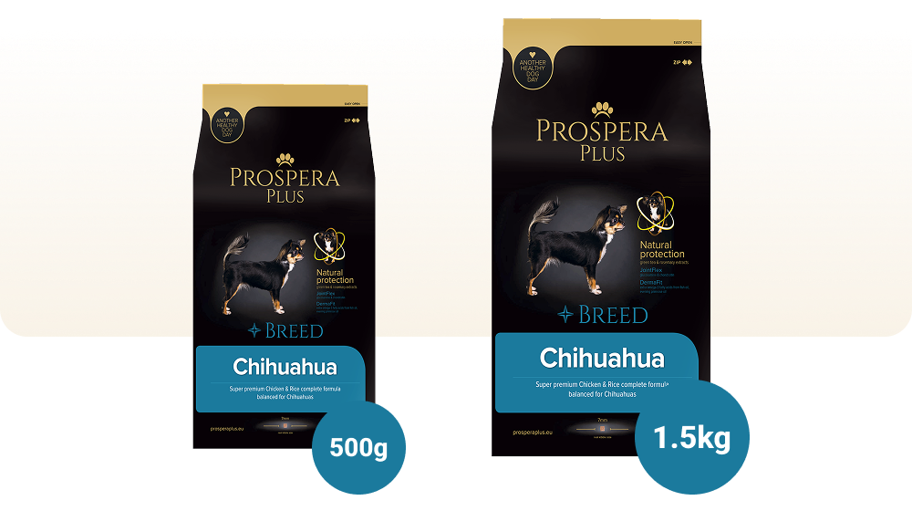 Krmivo Prospera Plus Adult Chihuahua je přizpůsobeno potřebám malého plemene s vysokými nároky na chutnost a výživu. Podporuje energii, zdraví kůže i srsti a trávení.